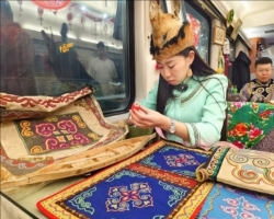 2025年1月11日,在中国铁路哈尔滨局集团有限公司开行的哈尔滨开往漠河的K7041次列车上,5名鄂伦春族非遗文化传人为游客展示了桦皮画、面塑、刺绣等非遗文化项目。这是首趟民族非遗文化列车,随着省...