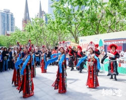 5月1日下午 一群身着独特民族服饰的俊男靓女 现身上海徐家汇书院广场 曼舞欢歌的场面吸引了 不少市民游客驻足观看 来自西藏的萨迦县歌舞团与 上海音乐学院联合呈现的 歌舞快闪 拉开了